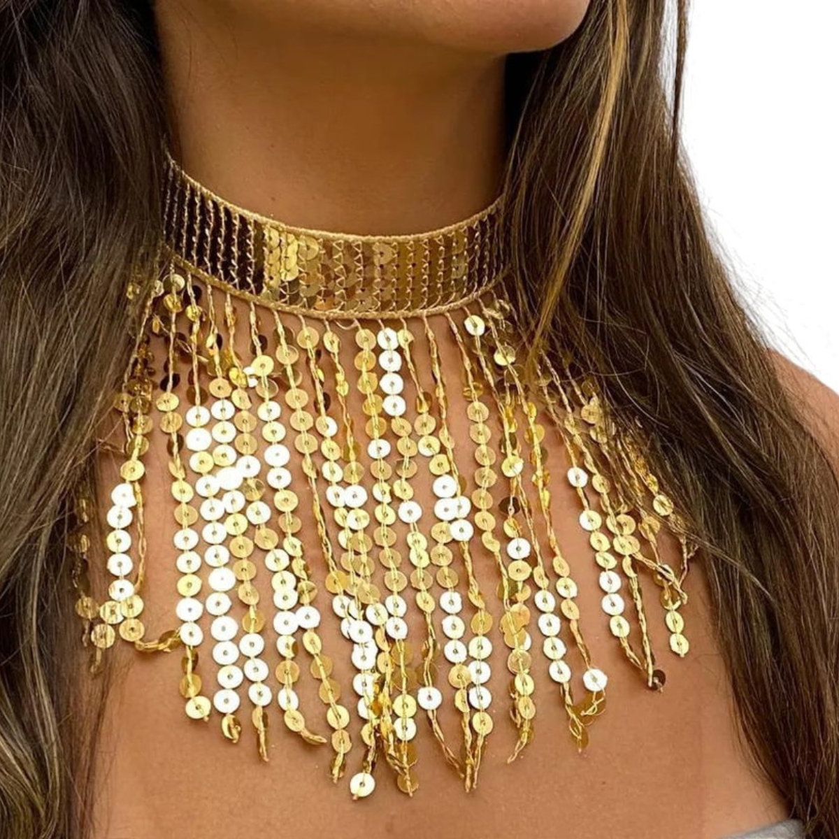 Acessório leve e elegante, com brilho intenso e movimento delicado que valoriza o colo. Ideal para dança do ventre, carnaval, eventos, apresentações e produções especiais.