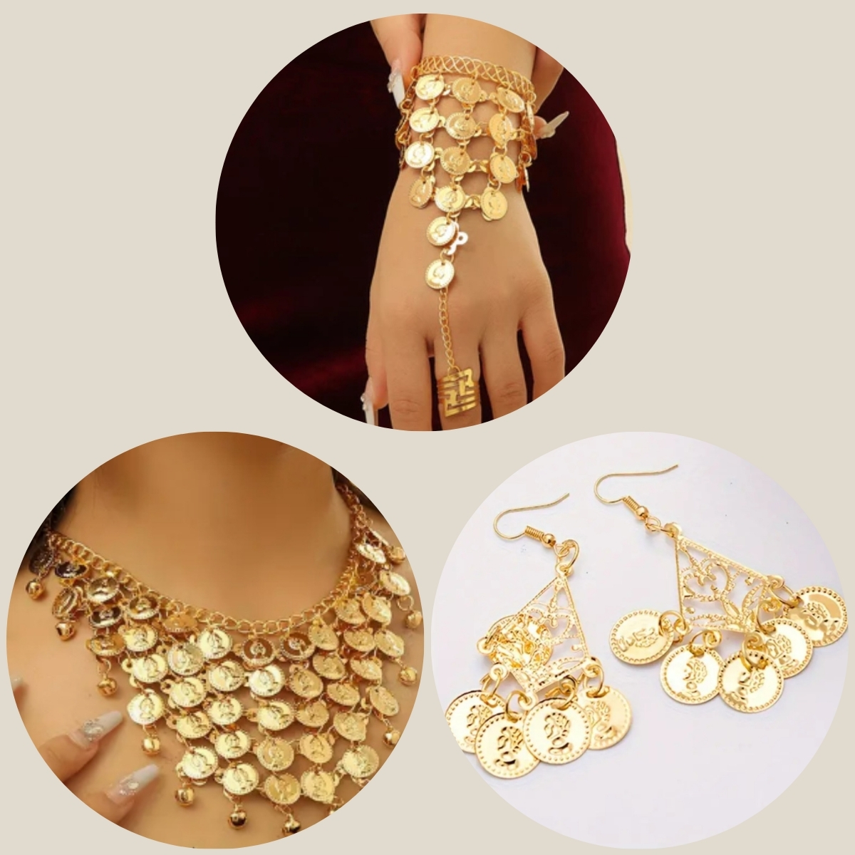 Combo 3 em 1 , Par de Pulseira, Colar e Brinco - Dança do Ventre - Cigana