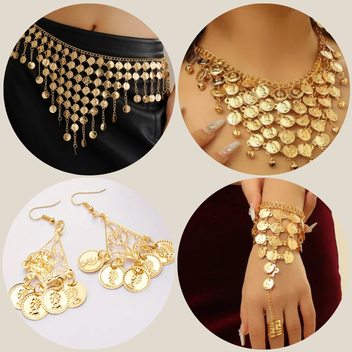 Combo 4 em 1 , Cinto, Par de Pulseira, Colar e Brinco - Dança do Ventre - Cigana