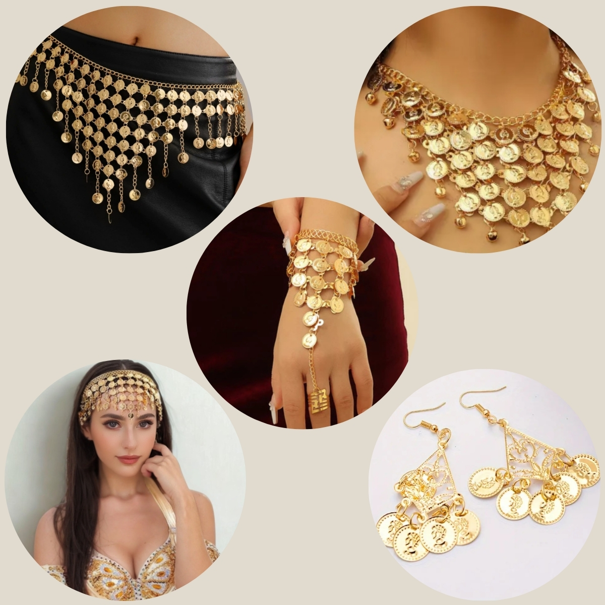Combo 5 em 1, Cinto, Par de Pulseira, Tiara, Colar e Brinco - Dança do Ventre - Cigana